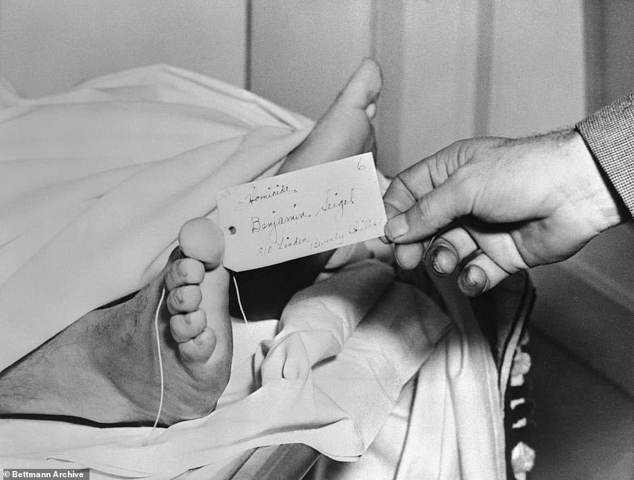 This iconic black-and-white photo shows Siegel's body on a morgue table, with a tag looped on his toe.
