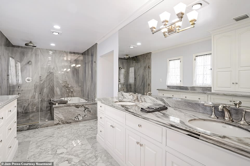 The second floor includes a remodeled bathroom with marble-clad counters, floors and bath.