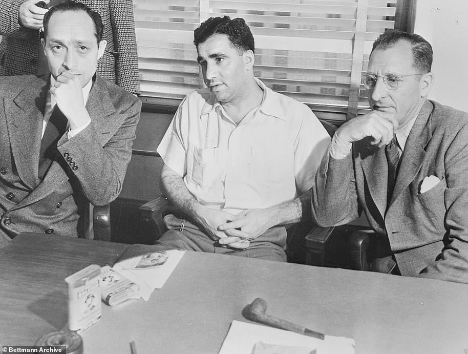 Al Tannebaum (l-r), Abe 'Kid Twist' Reles and District Attorney Burton Fitts give evidence on Siegel.