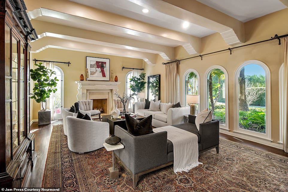 Arched windows, hardwood floors, and hand-carved coffered ceilings ooze Old Hollywood glamour.