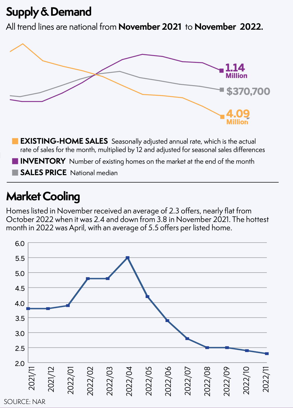 Only 28% of home sales in November were by first-time buyers. That’s unchanged from October but up from 26% in November 2021. NAR’s 2022 Profile of Home Buyers and Sellers, released in November, found that the annual share of first-time buyers was the lowest since NAR began tracking the data.